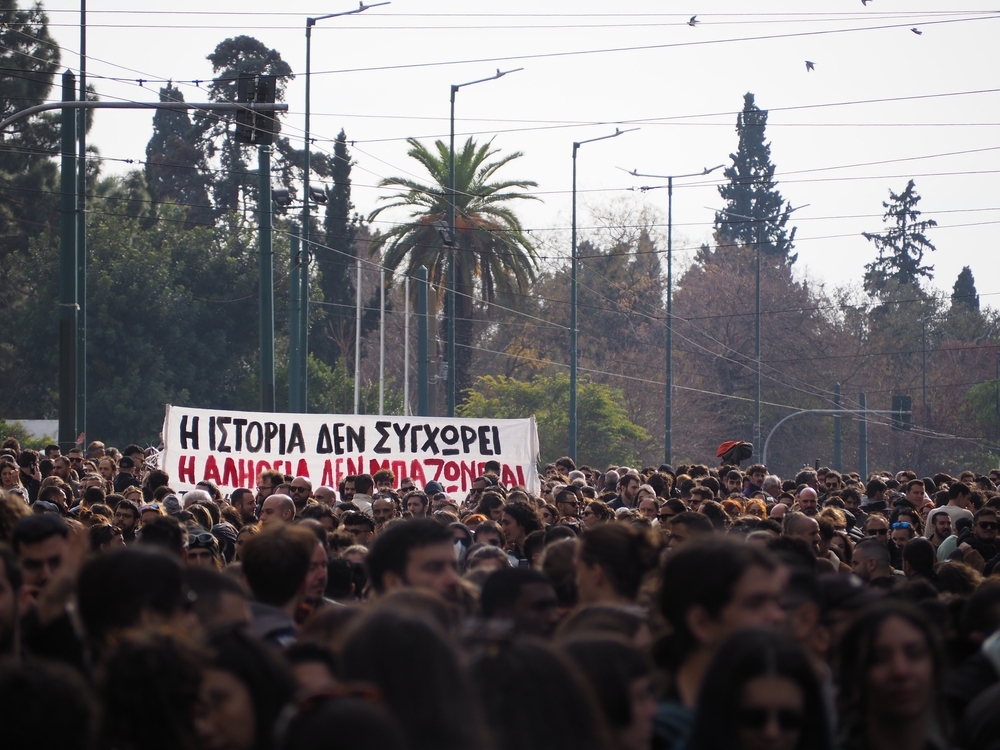 Proteste ad Atene legate all'incidente di Tempi, 26 gennaio 2025 (lo striscione dice "La storia non perdona") (© Konstantinos Dimitros/Shutterstock).