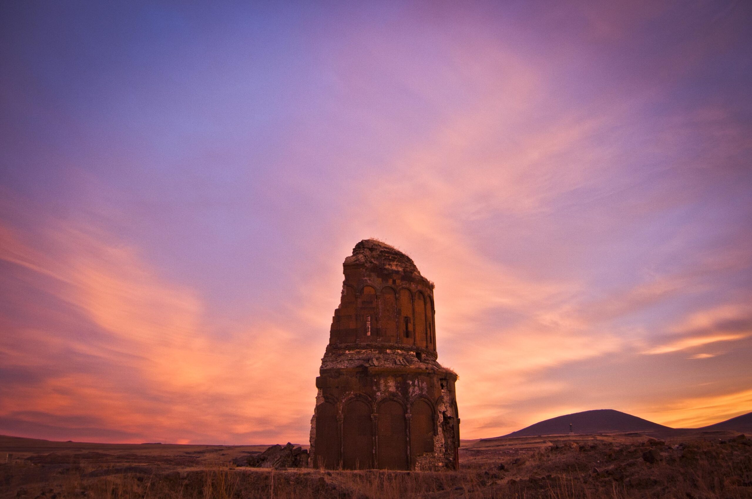 In questo punto dell’altopiano, dove il cielo non è meno concreto della terra, è la volta celeste a dar forma alle cose. Ani, battuta dal vento e dalla solitudine, non concede facilmente le sue spoglie. Come può essere questa la terra che nutre il mito del ritorno della diaspora? Ma quando il sole sparisce dietro il profilo basso dell’orizzonte, lasciando in eredità una secrezione di rosso, l’acciaio del cielo inizia a fondere e Ani cambia colore, passando dal grigio alla porpora. I monumenti tornano in qualche modo all’eternità per cui furono pensati, prima che il secolare lavorio umano venisse meno. In questo tempo immobile il fantasma del popolo deportato torna a popolarla, avverando la profezia di Sarop. E la solitudine si trasforma in privilegio.