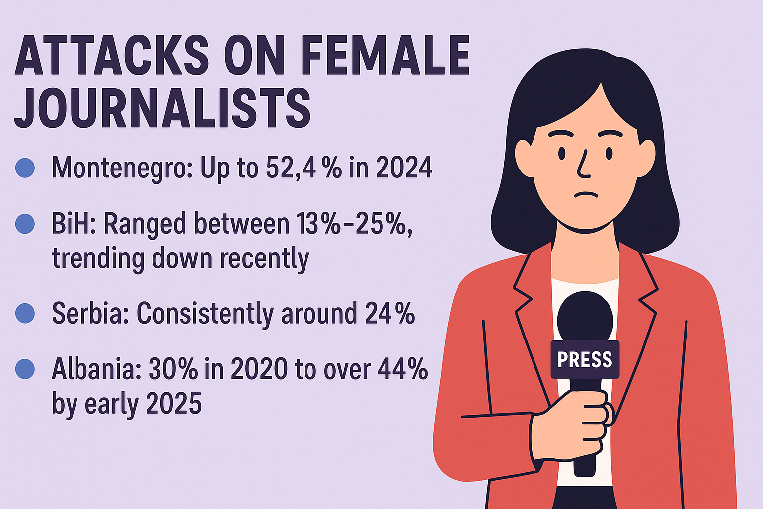 From January 2020 to the end of April 2025, every fourth attack on media workers in Albania, Bosnia and Herzegovina and Montenegro targeted female journalists. Out of 750 reported cases of attacks on media professionals and organisations, 200 involved women.